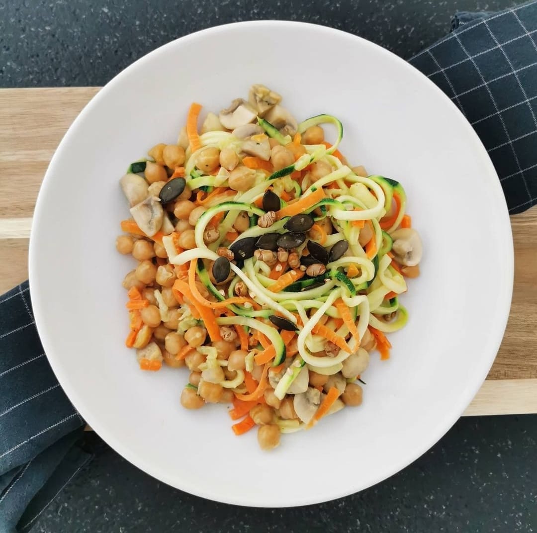 - Zucchini und Karotten mit einem Spiralschneider schälen, Champignons klein schneiden